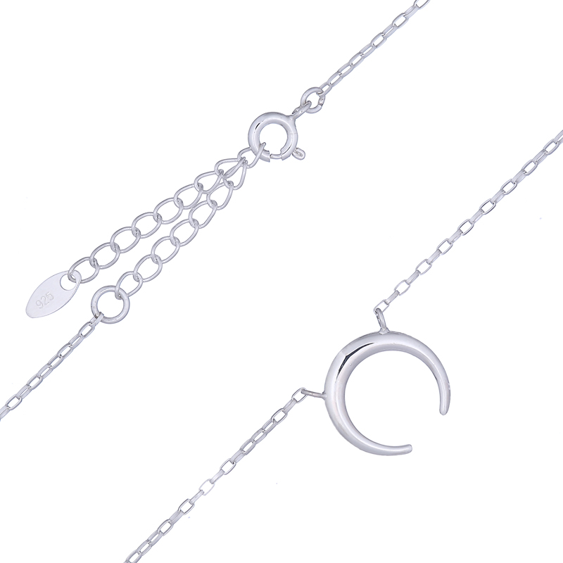 The paper clip box chain necklace features a crescent moon pendant, beautifully crafted in sterling silver. Its modern design appeals to customers seeking celestial-inspired jewelry. Retailers can enhance their collections with this stylish piece that combines elegance and whimsy.