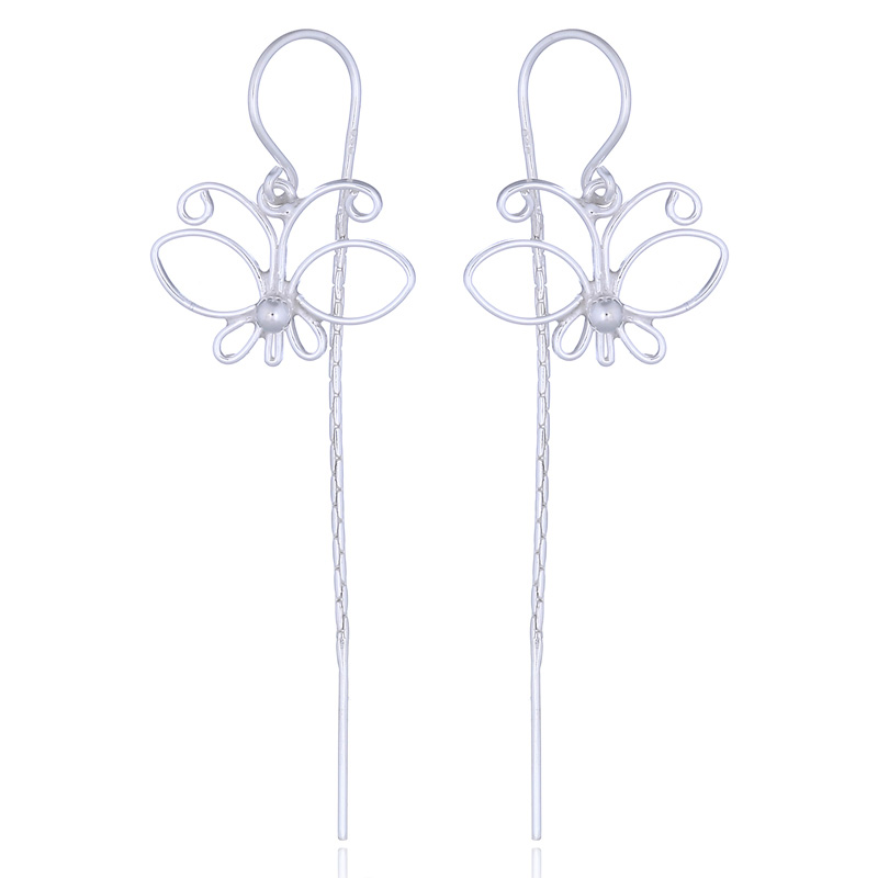Sterling Silver Threader earrings present on dainty fine chains delicate wirework butterflies that float gently in the air. Superb threader earrings design crafted of Hallmarked 925 silver adding a graceful style to the looks and flanking the features with fine silvery shining lines that stage dangling butterflies on their ends.