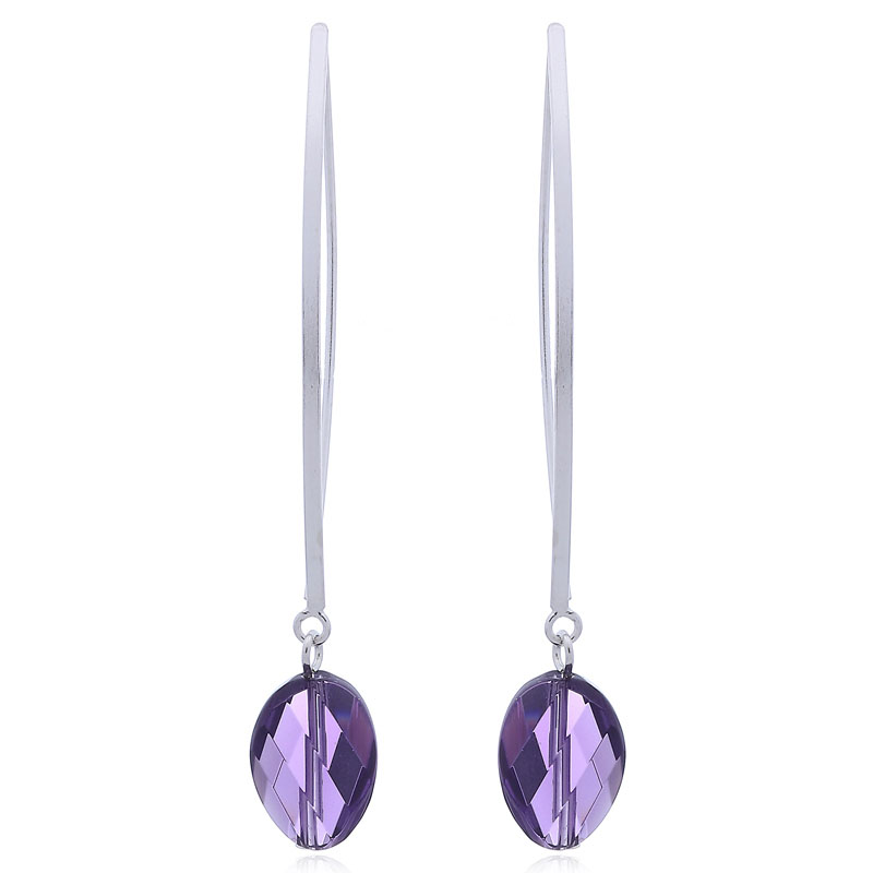 The facet cut oval shaped premium quality Czech Glass Crystal is prominently staged by these delicate Drop earrings that are fashioned with Sterling Silver. The vivid rich purple color of the Glass Crystal refracts the light on its spectacular faceted surface generating an exquisite sparkle. Attached flexibly to the softly curved long stick hangers pretty and fashionable Drop earrings are created that are fun and a delight to wear.