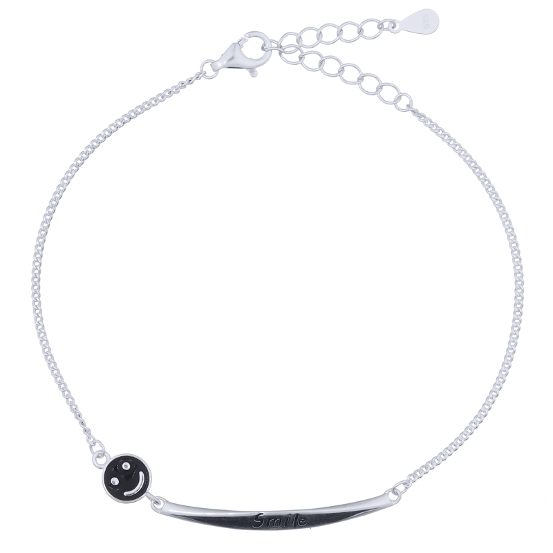 This radiant 925 sterling silver Smile Emoji bracelet features a classic curb chain with a charming silver circle disc adorned by a playful smile emoji and the word “smile” engraved on a matching silver plate charm. Perfect for retailers seeking uplifting, trendy jewelry that delights customers.