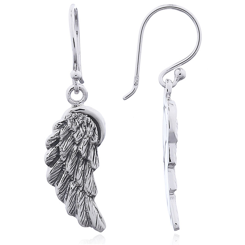 Resembling the wings of an angel or a pair of strong eagle wings this pair of antiqued Sterling Silver danglers are beautiful. The antiqued finish brings up the finer details of each individual feather each wing formed by 3 rows of increasingly longer feathers for a balanced and realistic look.