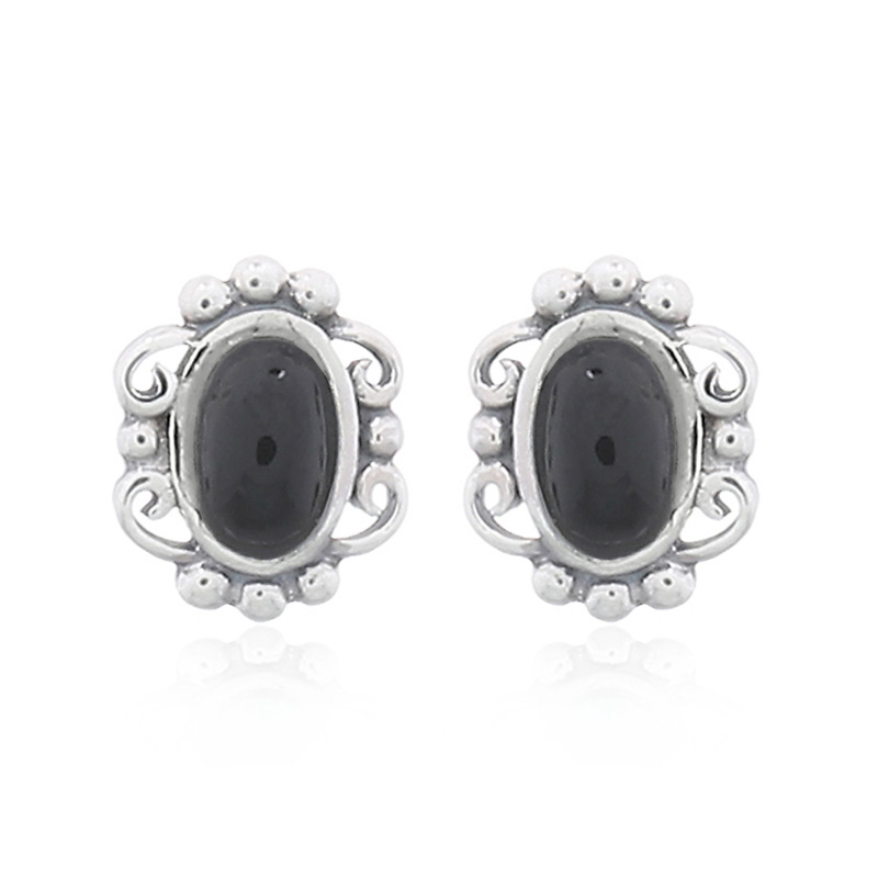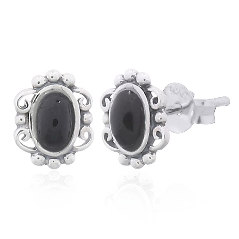 Add a touch of sophistication to your inventory with these oval filigree stud earrings featuring a striking synthetic black stone. Their intricate design is sure to catch the eye of customers looking for unique and elegant pieces that make a statement.