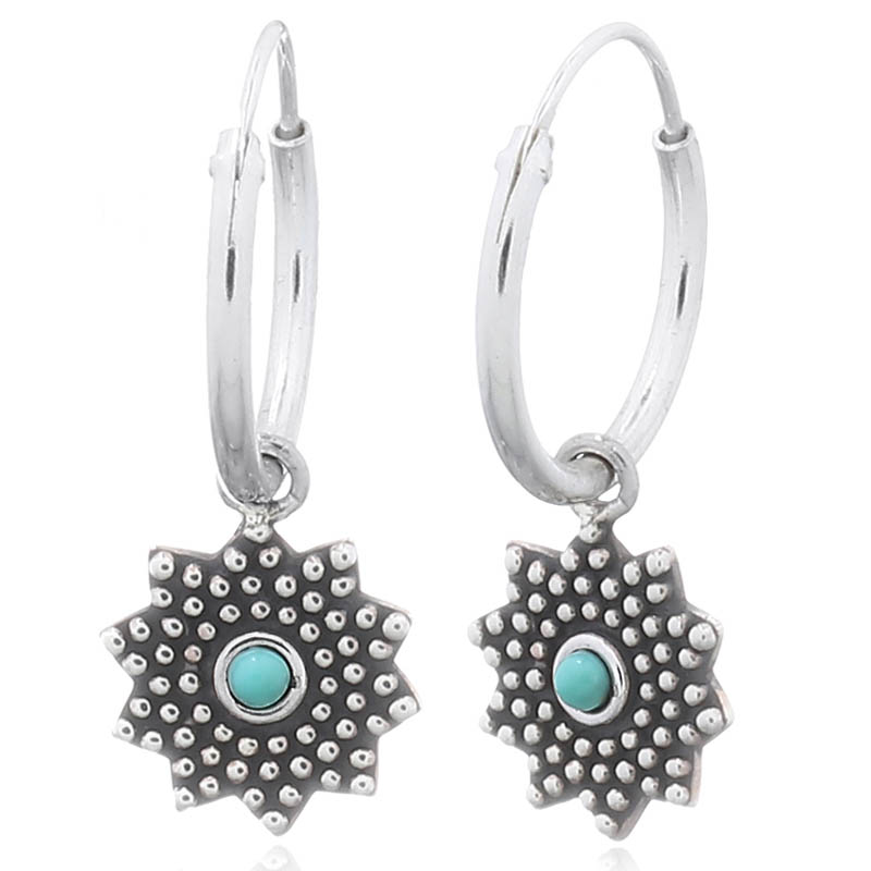 Make a statement with these sunflower hoop earrings, showcasing eye-catching synthetic turquoise. Their vibrant color and playful design make them an excellent choice for retailers wanting to attract customers seeking fun, stylish accessories.