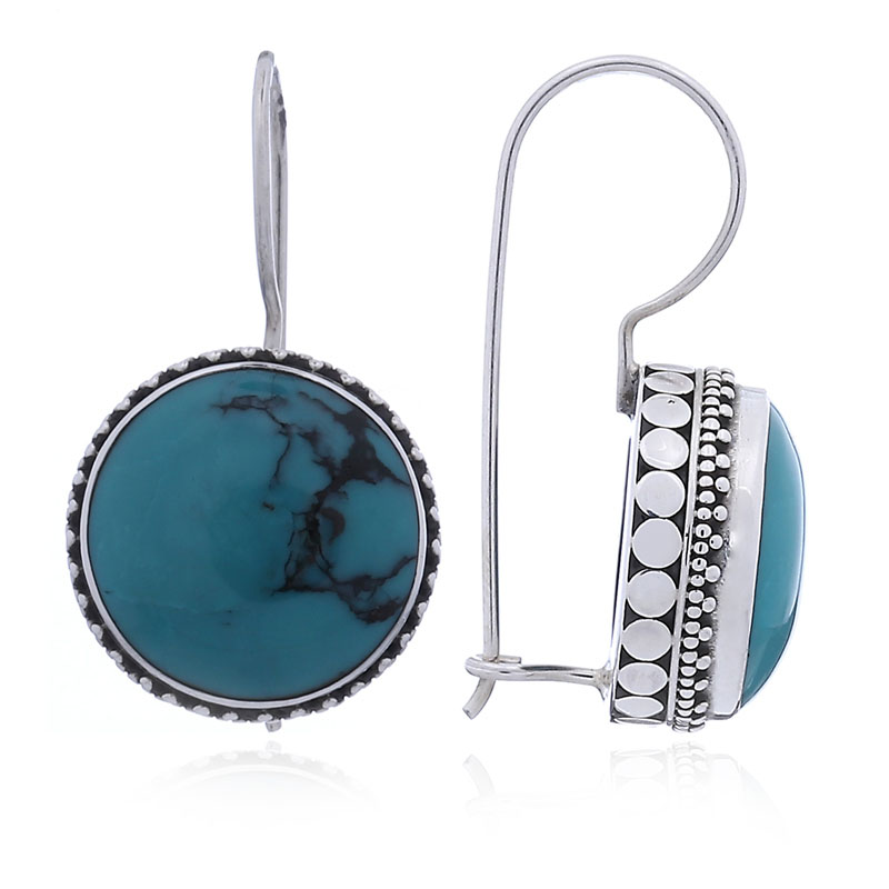 Embellished with an antiqued ornate silver border the bezel set Turquoise cabochon beautifully polished and waxed is featured by these Drop earrings. The high polish finish setting is surrounded by the beautiful antiqued beaded border and shiny circles that add a rich and valuable look and contrast the vivid color of the gemstone perfectly. Handmade earrings that are secured with leverback clasp and fashioned in Sterling Silver make gorgeous earrings that cater the taste of women with high expectations.