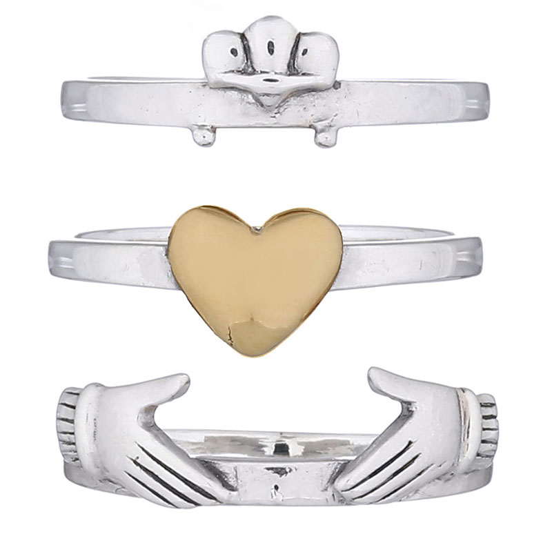 Silver Claddagh Ring 3 In 1 is 925 Sterling Silver ring with a gold plated sterling silver heart. This Claddagh ring separates into 3 bands that could be worn alone or together to create the popular symbol. the pieces are crafted of sterling silver polished to perfection to create a unique three in one Claddagh ring of great value.