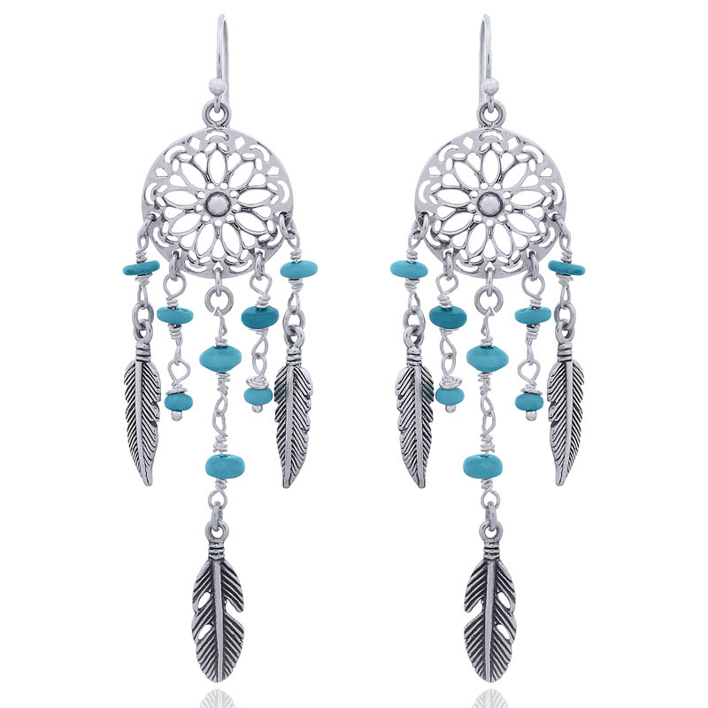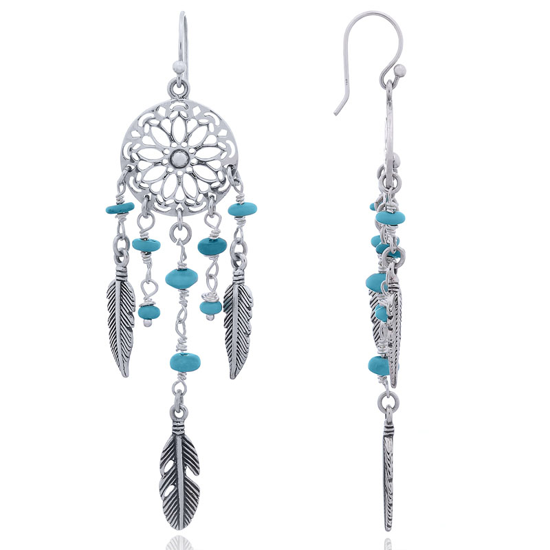 Dreamcatcher jewelry in silver and turquoise gemstones looks fantastic as an example is this pair of 925 silver dream catcher earrings with smooth turquoise beads distributed along each silver chain. Two types of antiqued silver feathers provide great balance to the design.