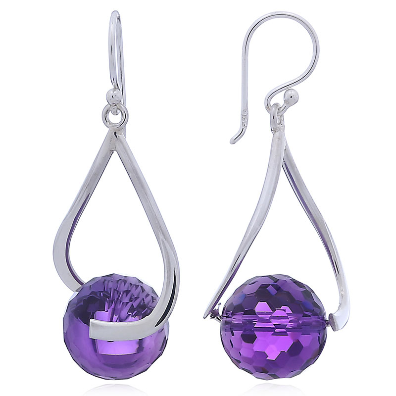 Sphere cut multi-faceted purple Czech Glass Crystal held between elegant Sterling Silver loops which are curved into opposite directions create a gorgeous pair of vibrant earrings . The strong purple color has a vivid flair and ranks high in popularity – these Dangle earrings with hooks simply jazz up an outfit with style.
