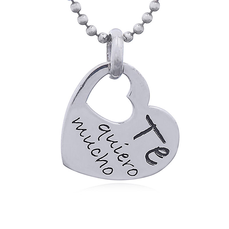 Thin precise oxidized grooves on the surface of this heart shaped 925 pendant make the sentence “Te quiero mucho” which means “I love you a lot” in Spanish.