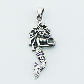 The mythological icon that lives in the sea and looks like a woman with the tail of a fish has a her steady place in folklore literature and fairy tales and is rooted even deep in cultures. Our designed and produced Planet Silver jewelry mermaid is crafted of Hallmarked 925 ornate silver and makes one beautiful Sterling Silver charm pendant. Gracefully she holds a shell her long hair is floating and the fine detailed scales and tail fin are beautifully ornamented and carefully dusted with antique finish to accentuate the recessed parts. This silver mermaid charm brings an enchanting jewelry to the neckline.