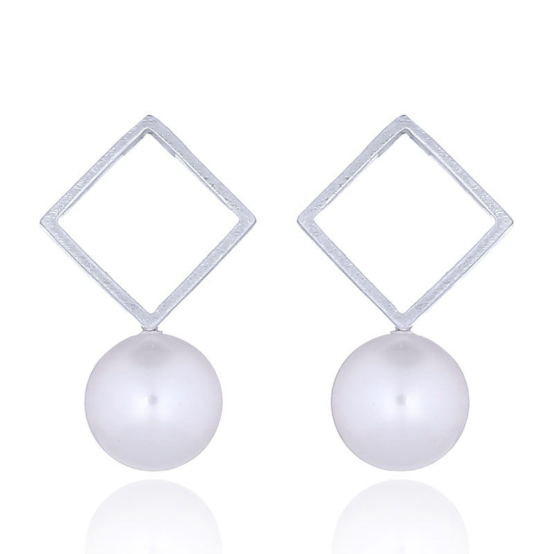 Sterling silver with an open square matte finish and Swarovski crystal pearl stud earrings. Pearl diameter approx. 8 mm.