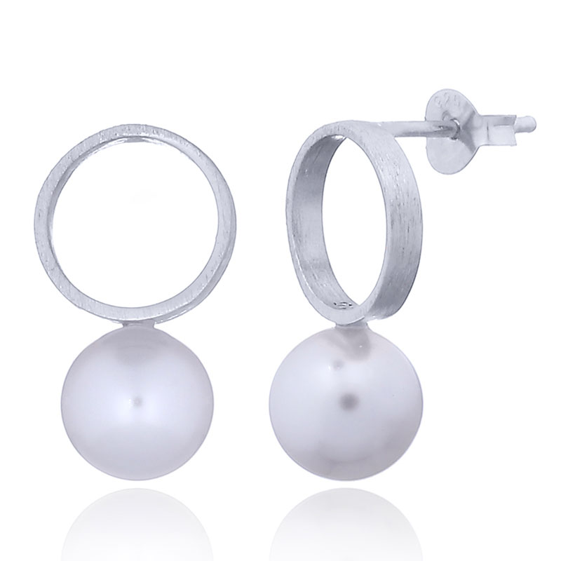 Sterling silver open circle matte finish and Swarovski crystal pearl stud earrings. Pearl diameter approx. 8 mm.