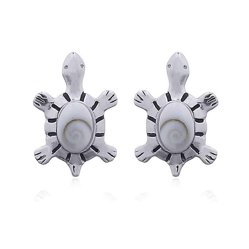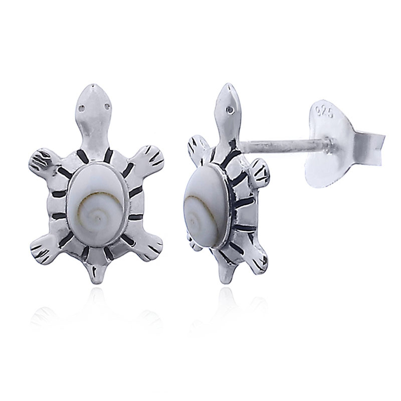 Super cute very well made silver turtle studs showcasing an oval Shiva eye shell on their shells the oval Shiva eye shell itself is about 4×6 mm. Of a small size yet not extremely diminutive these little silver stud earrings are the perfect size for comfort.