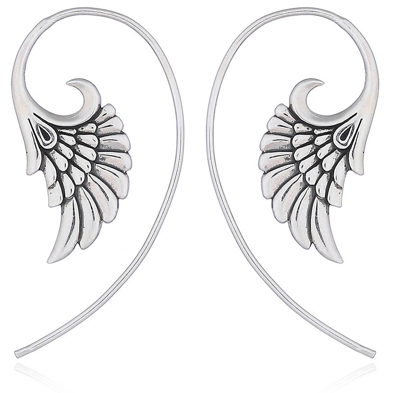 Elegant fan-shaped angel wing earrings are shown spreading out their individual silver feathers. Made in polished sterling silver the wing drop earrings show a beautiful polished finish.