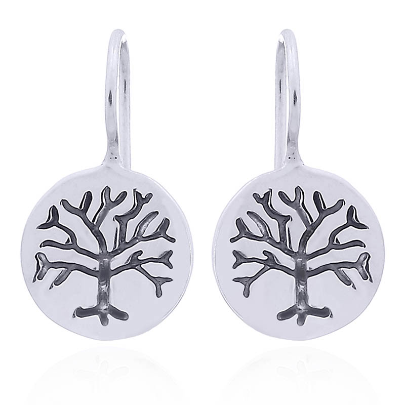 Perfectly circular 12 mm Sterling Silver discs display a pair of minimalistic trees of life stamped on their highly polished surfaces. The darkened figure of each tree really jumps out of its shiny background. Gently curved round silver wires are attached to the top of each disc to function as the hooks of this pair of beautiful drop earrings.