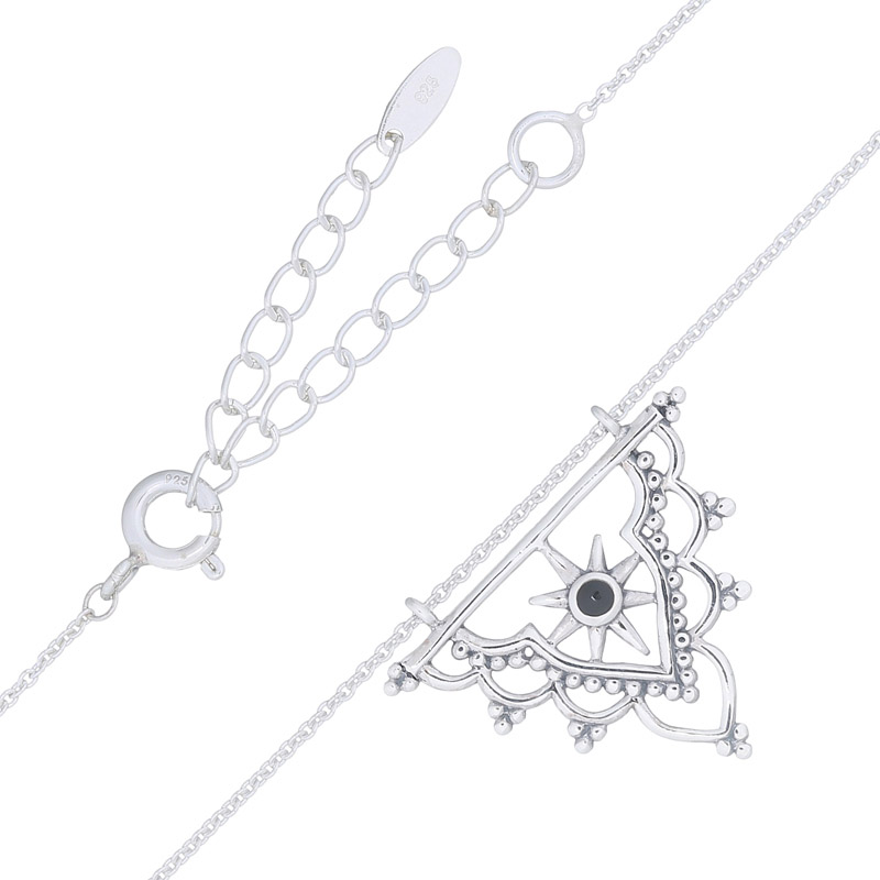 This antique silver necklace features a star focus design complemented by a black constituted stone. Its bold look attracts customers seeking distinctive jewelry. A striking addition to any collection, it stands out for both casual and formal styles.