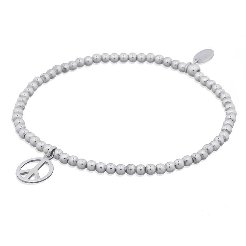 Polished 3mm round Silver beads are inserted into an elastic cord that turns this piece into a free size bracelet. Planet Silver bracelet of classic appeal enhanced by a popular silver peace charm. Premium quality bracelet this is truly a gem with great sales potential. (Dimensions of peace charm 10 x 15 x 1 mm). (Minimum length: 18 cm).