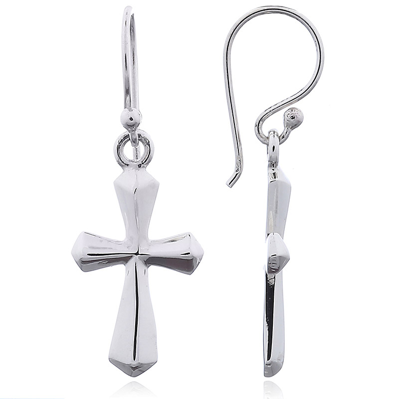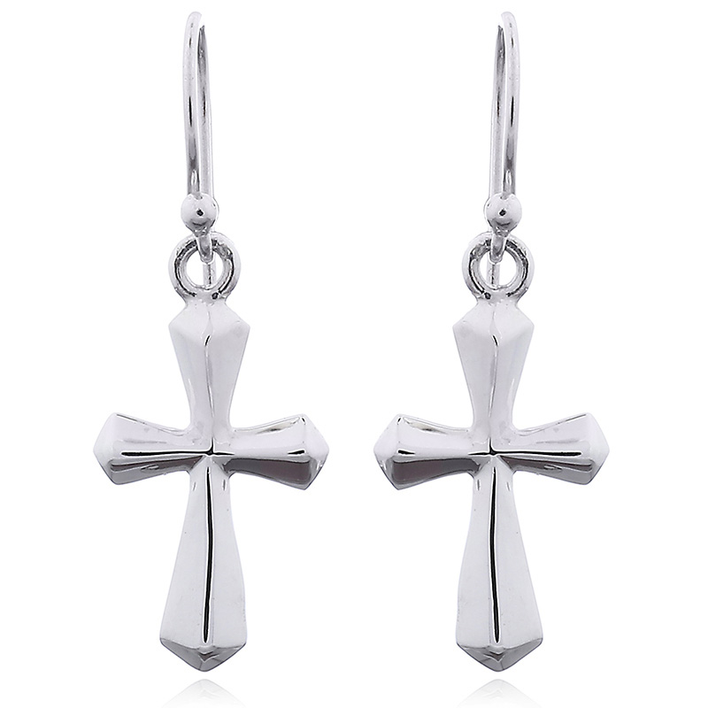 From out the center of this fine cross the arms gain gradually in width toward their ends. The beveling creates a fine play of light and shadows. This cross is made of Sterling Silver and comes with hooks.