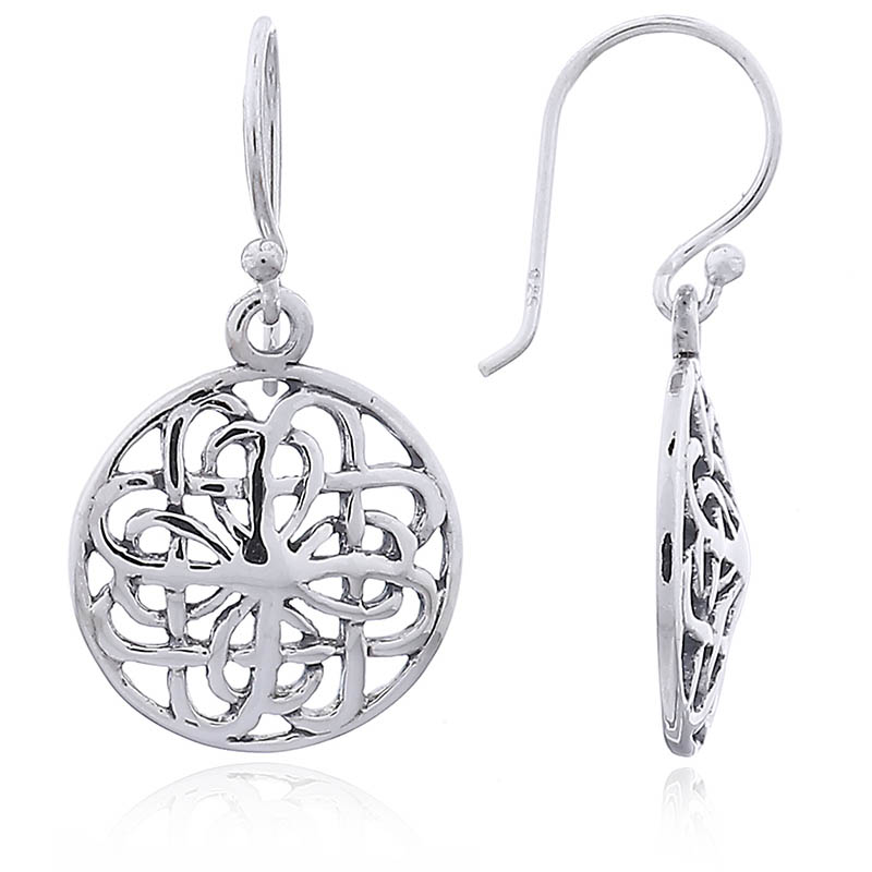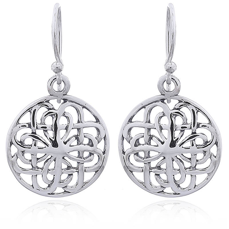 Amazingly fine silversmith work and a brilliant design created these Celtic Dangle earrings that carry in the center a flower that is flowing from the intertwined lines and takes on shape to loose itself again into the never ending line of the Celtic circle shaped pattern. Strikingly beautiful earrings of a decent size that gain additionally attractiveness from the slightly convex open surface.