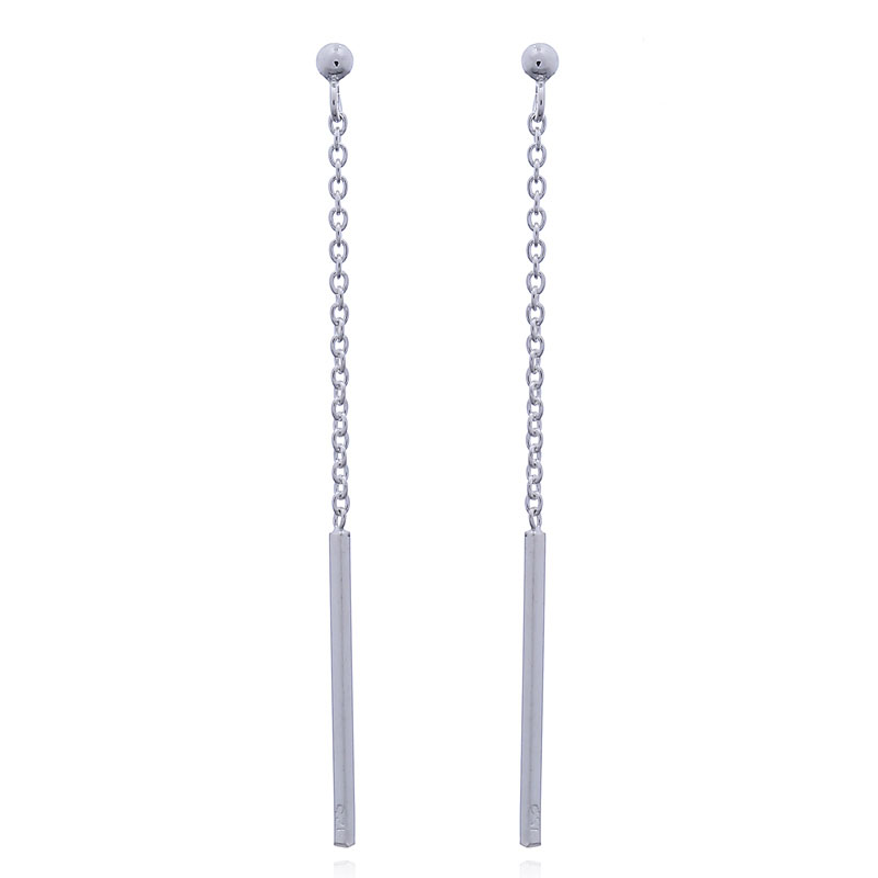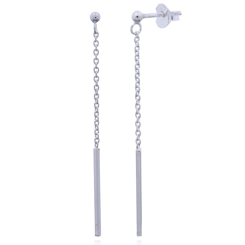 Sterling Silver earrings feature a lightweight spiga chain that dangles on the semi-spherical post and presents a shiny stick at its end. Hallmarked 925 silver Stud earrings that flank the features with a fine silver line are secured with silver butterfly backs and make earrings that are like a breeze easy on the earlobe and discreet Yet showing a generous length they make popular silver jewelry that makes girls look pretty with a dash of bright alluring shine and a fine dangle.
