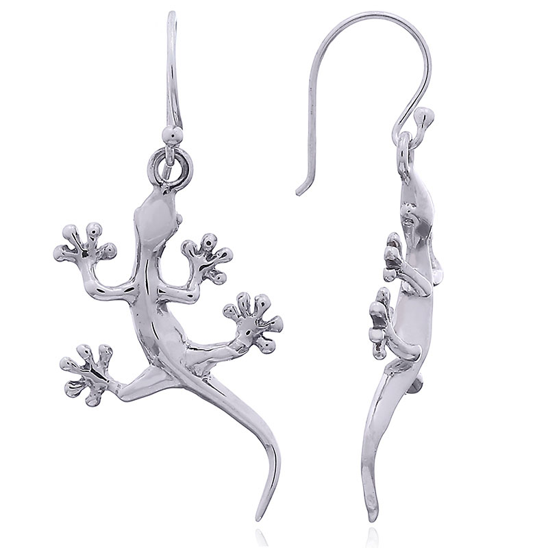 Sterling Silver unique Planet Silver designer Dangle earrings present cute lizards on swing loops. The animals are superbly crafted of Hallmarked 925 silver living in the tropics and mostly referred to as “Gecko” these adorable animals share the homes and move in houses with an incredible speed across ceilings and walls where they eat insects and spiders. Smooth shiny silver bodies fine detailed toes and long tails create truly original silver jewelry that looks surprisingly authentic when dangling from the ear. Gorgeous silver Gecko earrings state the affinity we have with these “pets”.