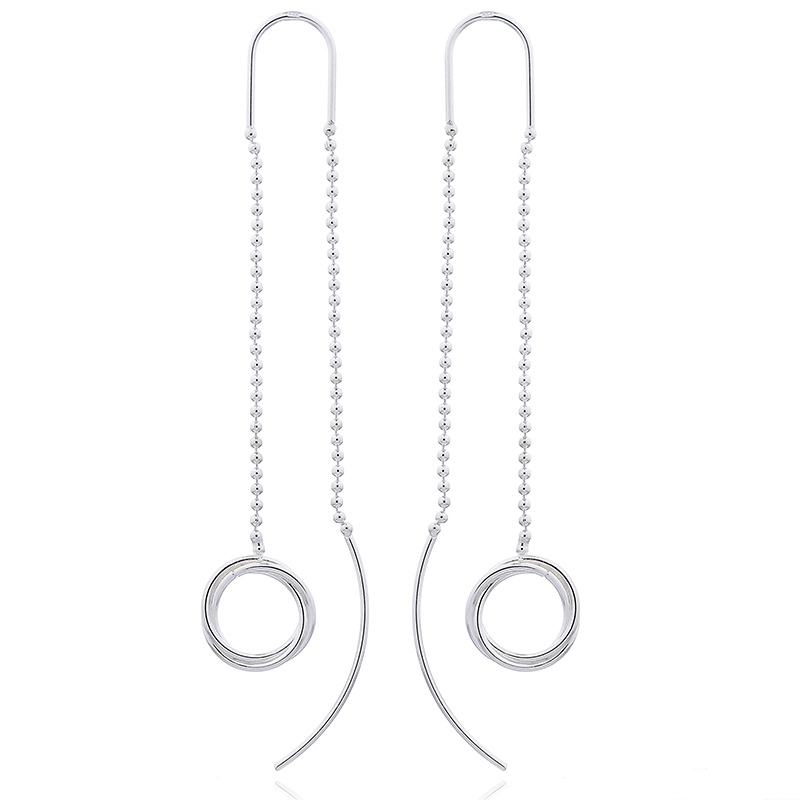 These earrings are adjustable in length. The 10 mm circle shapes are made from wires that intertwine creating a visually appealing ornament; each circle is suspended from a length of sterling silver bead chain which threads through piercings and allows one to choose the length by pulling front or back.