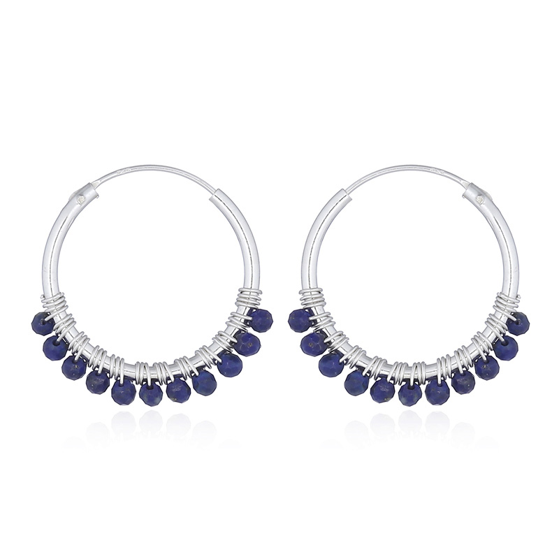 Faceted lapis lazuli beads are listed on sterling silver circle hoop.