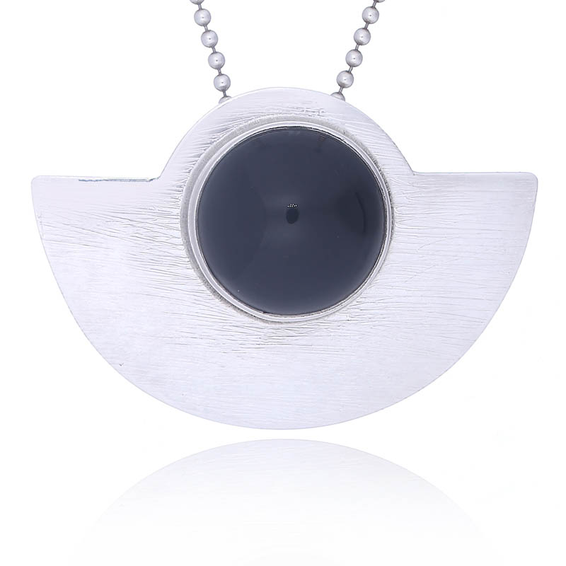 925 Sterling Silver Pendant features the 17 mm Black Agate gemstone cabochon round cut and polished as the center-point of this gorgeous gemstone silver jewelry. Deep set onto the horizontal top line of the large silver semi-circle and surrounded at top by a petite flange that hides the bail a fabulous shaped Black Agate silver pendant embellishes the neckline of a woman with an elegant high fashion style. The glossy black of the gemstone contrasts the bright lustrous silver remarkably and brings a high class fashion silver jewelry to women.