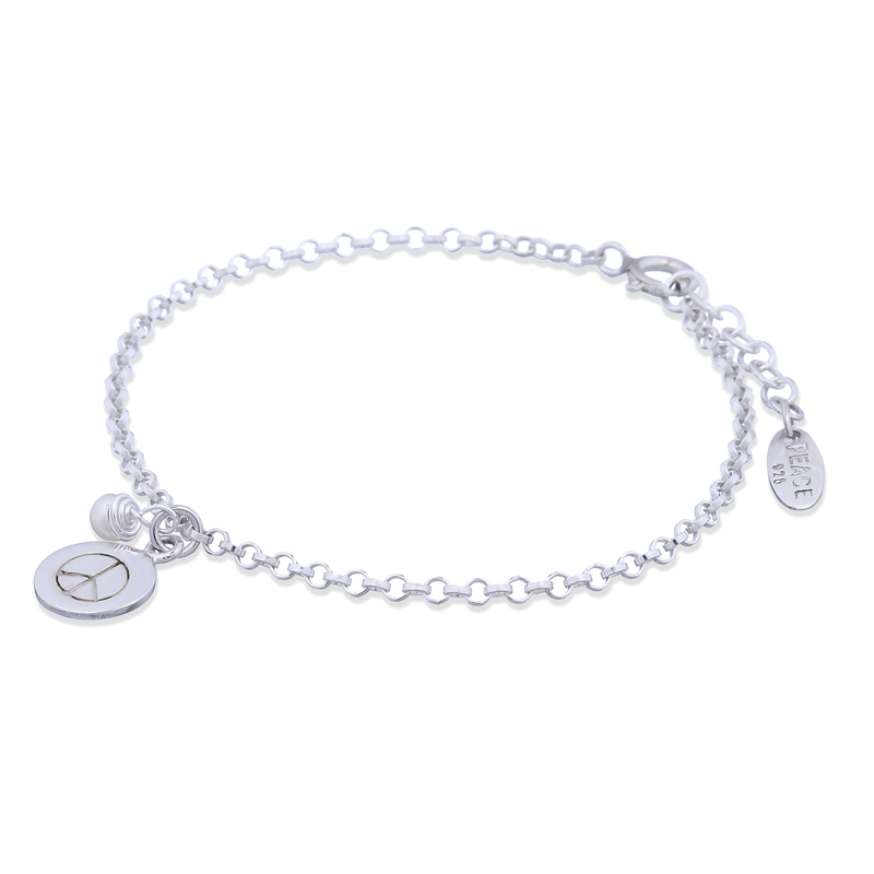 A plain highly polished 925 Silver Rolo chain with its symmetrical round links creates a pleasingly charming bracelet. A 925 Silver disc with a stamped peace sign on its shiny surface appears next to an iridescent Freshwater Pearl. An extra 3 cm chain next to the spring clasp converts this accessory into an adjustable bracelet. (Dimensions of disc peace charm 11 x 16 x 1 mm).