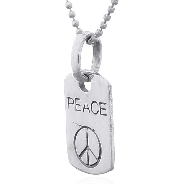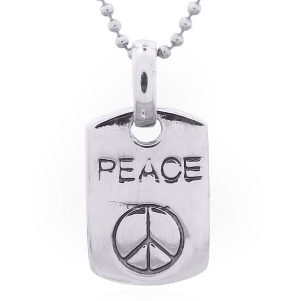 Relatively large bail loops through the round opening at top of the rectangular Sterling Silver tag that is generously curved top and slightly at bottom with softly beveled edges. Engraved are the word PEACE in capital letters and the peace symbol below creating a pendant that is worn by men and women that prefer the casual jewelry style.