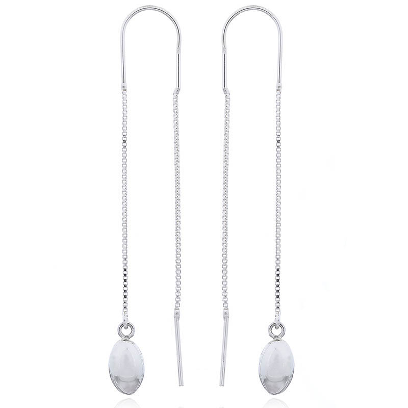 Superbly designed long Sterling Silver Threader earrings present dangling convex drops on long delicate box chains! Threaded easily with the fine wire through the hole in the earlobe and kept in place by the U shaped wire this silver jewelry has a great embellishing effect. A touch of silver and a dash of grace make up this pair of earrings that are lightweight and a pleasure to wear! Providing a delicate finishing touch these earring are perfect to dress up with an elegant feminine style.