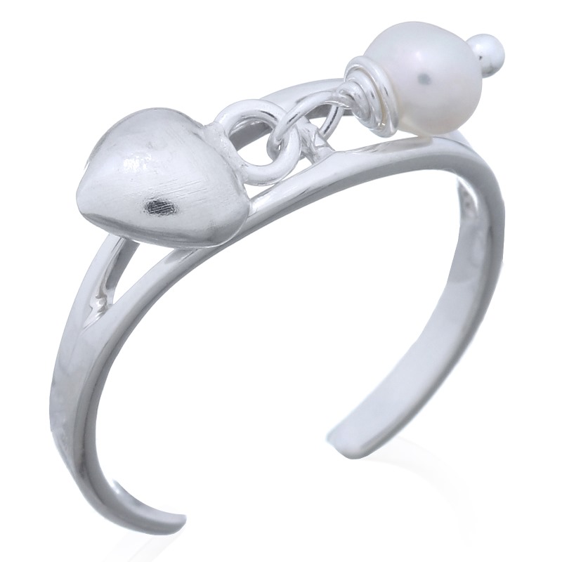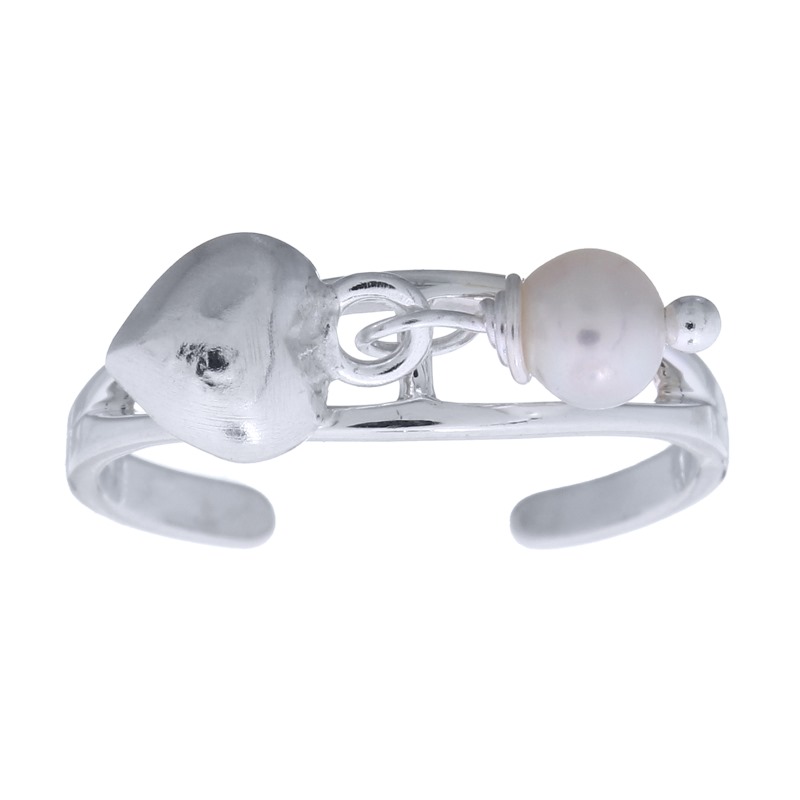 This Sterling Silver toe ring consists of a highly polished band that opens up both sides joined by a parallel section of silver to which a freshwater pearl and a small puffed silver heart are attached.