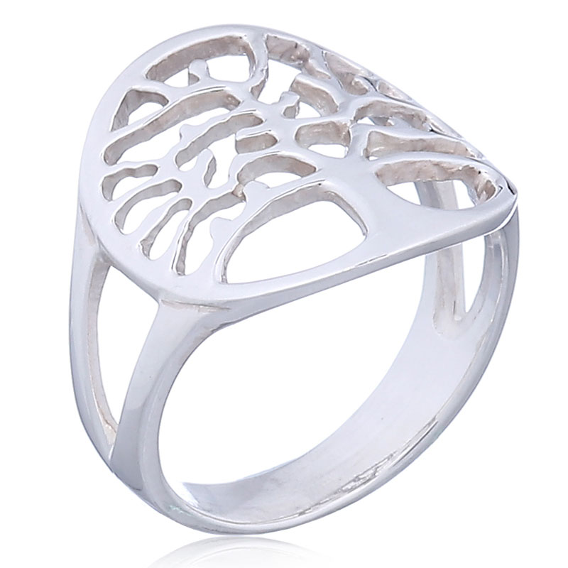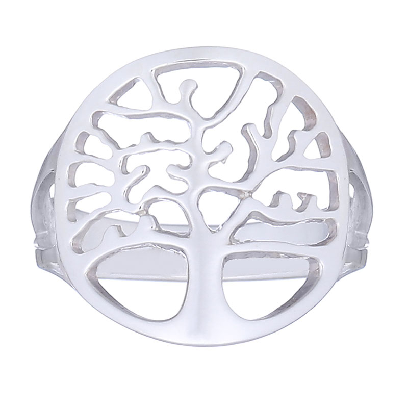 Polished sterling silver ring with a fresh design depicting the tree of life. The wide canopy of the tree extends with branches touching a round slightly convex rim. The almost organic spaces created by the tree’s silver branches are interesting too look at. The shiny sterling band of the ring divides in two. Silver tree of life ring manufactured by Planet Silver following very high quality standards to assure your satisfaction.