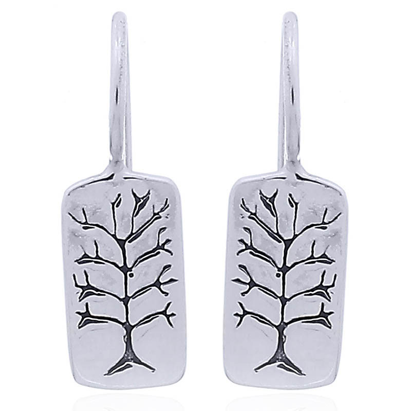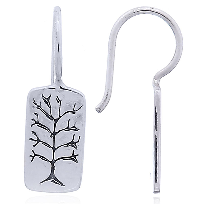 A rounded sterling silver rectangle plate displays a watered down representation of a tree of life. The tree is created by sharp darkened grooves that are in deep contrast with the shine of the silver. Polished sterling silver wire hooks soldered on top of each silver rectangle create this unique set of drop earrings.