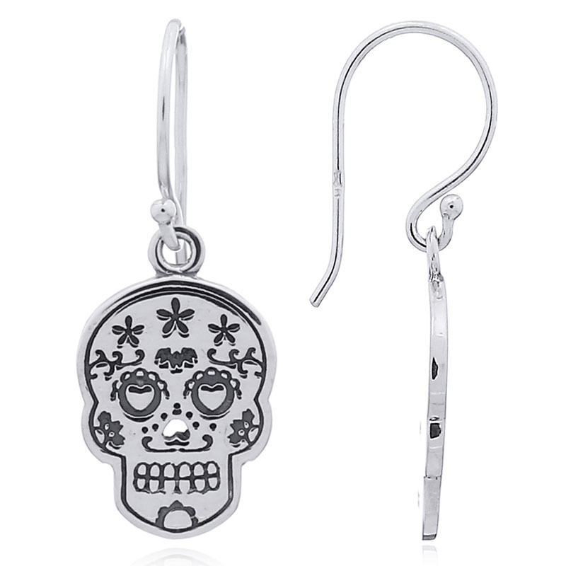 Sterling silver “calavera” skull earrings inspired by the Mexican day of the dead a holiday that is held in remembrance and to support the spiritual journey of loved ones who have died. The skull’s heart shaped love-struck eyes star shaped grooves and lines make this a unique pair of silver dangle earrings.