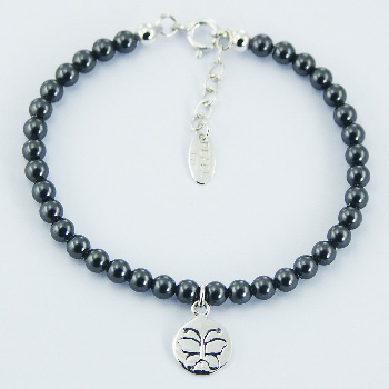 A highly polished Sterling Silver disc features the simple yet cute outline of a butterfly etched on its smooth surface. Spherical 4 mm-in-diameter Swarovski Crystal Pearls create a neat bracelet. At both ends of the bracelet spherical silver beads accompany the spring clasp and chain. (Chain length: 3 cm extra). (Dimensions of silver disc charm: 10 x 15 x 1 mm).