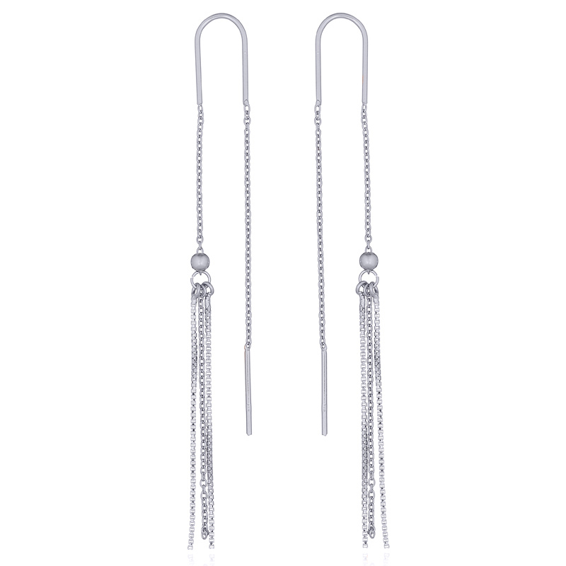 Modern pair of tassel threader earrings show a 3 mm silver ball from which a jump ring with 3 separate lengths of chain attaches. The movement and glitter of the silver creates a very beautiful effect.