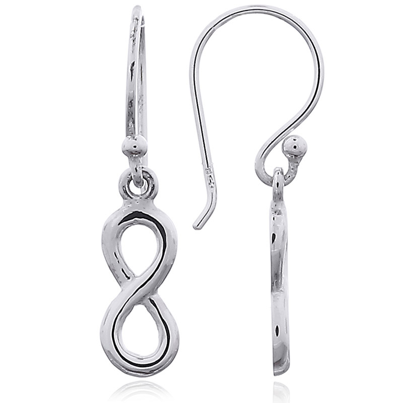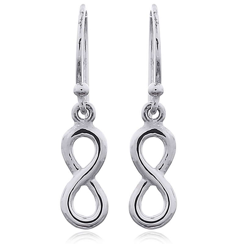 The shape of an line that seems to have neither a beginning nor an end has come to symbolize the infinite. The infinity sign in jewelry usually stands for never-ending love or friendship. Casted sterling silver dangler earrings with ear wires small and lightweight for every occasion.