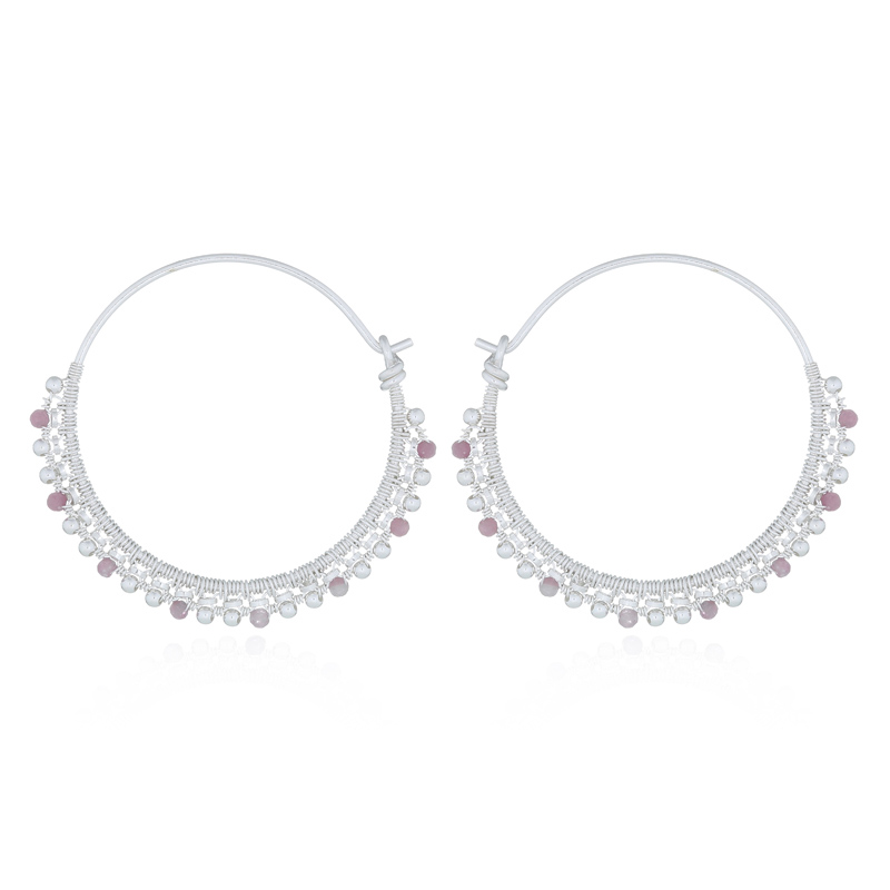 These threaded silver hoop earrings showcase a beautiful mix of tourmaline and spheres, creating a lively and colorful look. Their eye-catching design appeals to customers wanting to brighten up their jewelry collection.