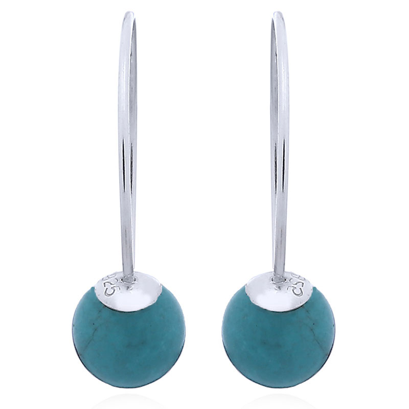 Handmade Turquoise Sterling Silver gemstone earrings stage smoothly polished glossy Turquoise gemstone beads clasped in Hallmarked 925 silver and welded to curved stick hangers producing stylish and modern silver gemstone earrings for all occasions. These earrings add a dash of silver and an attractive vibrant color to the style flanking the features with silver fashion jewelry that stands pleasantly out.