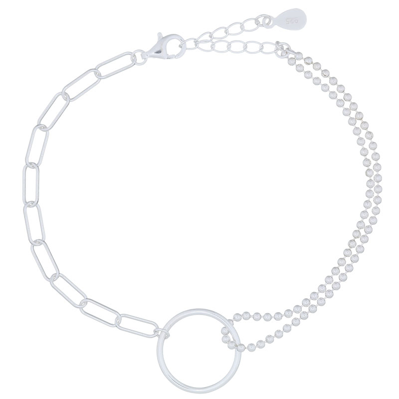 This bracelet features two chain styles with a sleek circle accent, offering a modern twist on classic design. Retailers will find it a versatile piece that appeals to customers seeking trendy accessories for everyday wear.