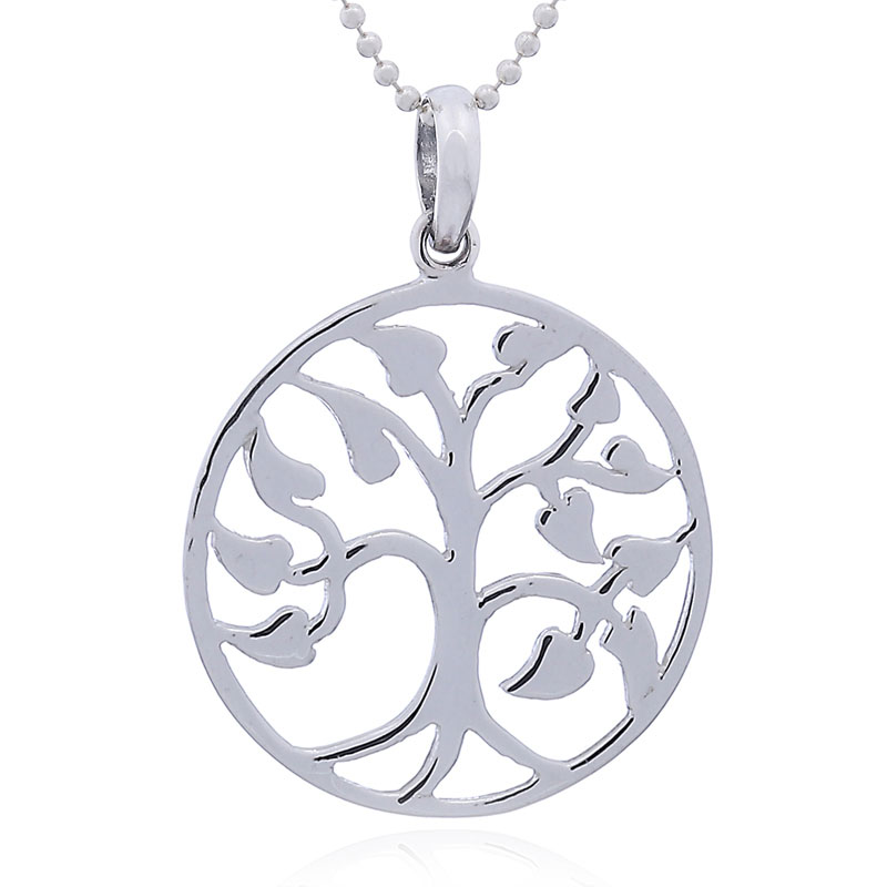 An Openwork Sterling Silver Pendant shows a shiny depiction of the symbol of the “Tree of Life. The leafy tree has branches that extend into its round frame attached to a slender trunk and large roots. According to ancient beliefs this tree is the representation of the union of heaven earth and the underworld.