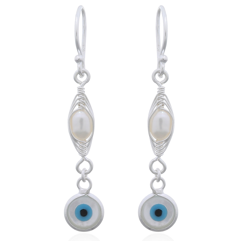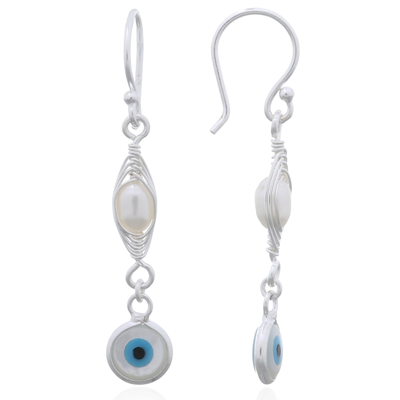Wire wrapped freshwater pearl and shell Nazar danglers offer a unique and stylish design. Perfect for an eye-catching accessory in your store. Enjoy factory-direct pricing for exceptional value.