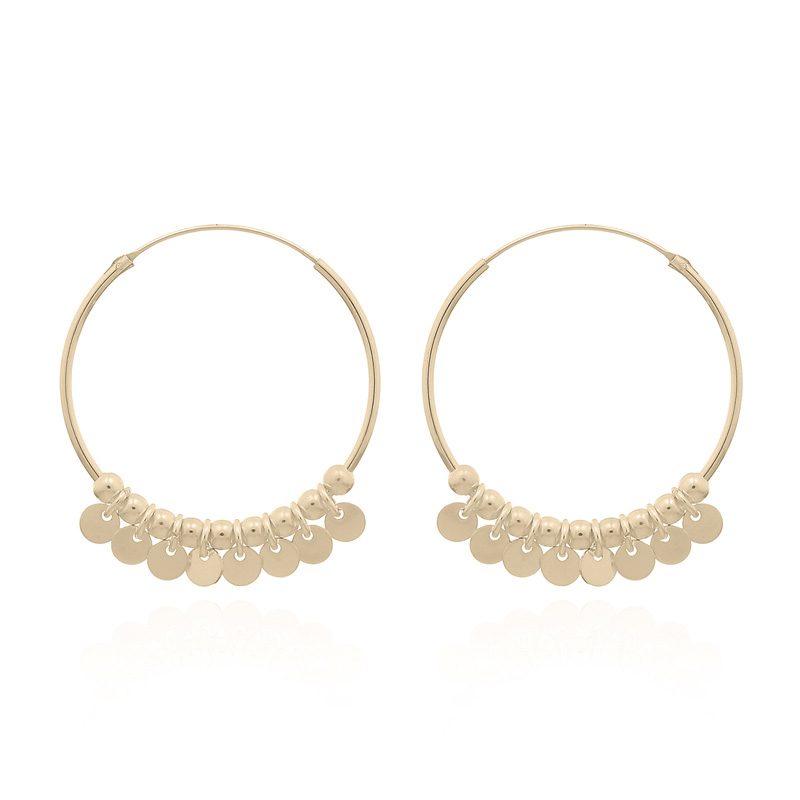 Very chic and lightweight perfect for parties! These hoop earrings are plated in yellow gold attached with the hoops are hammered discs and 3mm round beads in between.